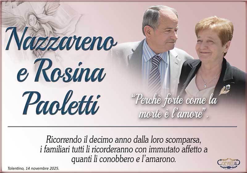 10° Anniversario: Nazzareno e Rosina Paoletti 10° Anniversario: Nazzareno e Rosina Paoletti 14 Novembre 2025 Gianluca Corvatta Manifesti RecentiRingraziamento: Giorgio BrunoriAlfei GinaAnniversario: Giuseppina Mattioli GiulianiRingraziamento: Maria Grazia Conforti AntoliniAnniversario: Mario CimarelliConforti Maria Grazia Antolini Gianluca Corvatta 14 Novembre 2025 Categories:Bacheca Manifesti 0 Likes
