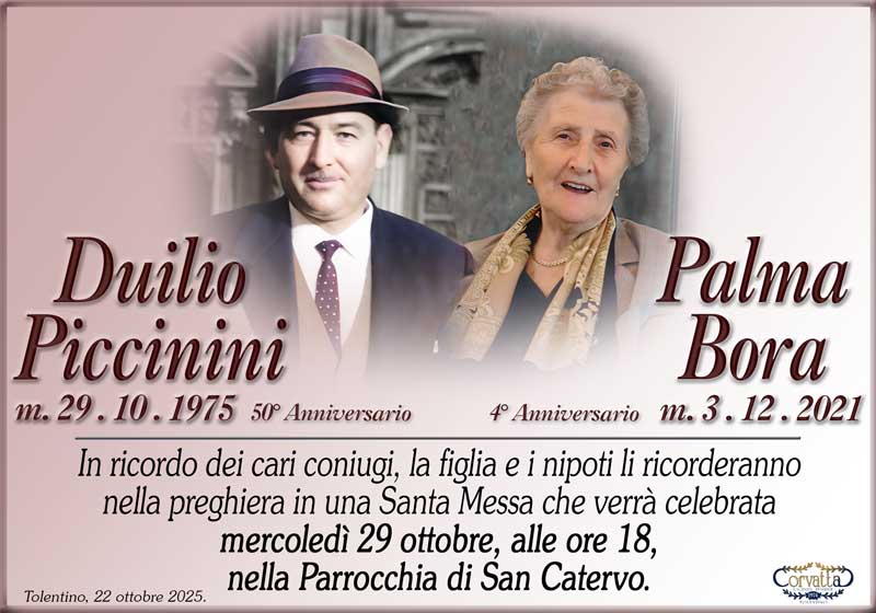 Anniversario: Duilio Piccinini e Palma Dora Anniversario: Duilio Piccinini e Palma Dora 21 Ottobre 2025 Gianluca Corvatta Manifesti RecentiRingraziamento: Giorgio BrunoriAlfei GinaAnniversario: Giuseppina Mattioli GiulianiRingraziamento: Maria Grazia Conforti AntoliniAnniversario: Mario CimarelliConforti Maria Grazia Antolini Gianluca Corvatta 21 Ottobre 2025 Categories:Bacheca Manifesti 0 Likes