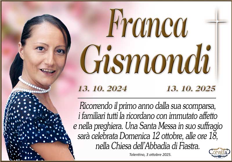 Anniversario: Franca Gismondi Anniversario: Franca Gismondi 2 Ottobre 2025 Gianluca Corvatta Manifesti RecentiRingraziamento: Giorgio BrunoriAlfei GinaAnniversario: Giuseppina Mattioli GiulianiRingraziamento: Maria Grazia Conforti AntoliniAnniversario: Mario CimarelliConforti Maria Grazia Antolini Gianluca Corvatta 2 Ottobre 2025 Categories:Bacheca Manifesti 0 Likes