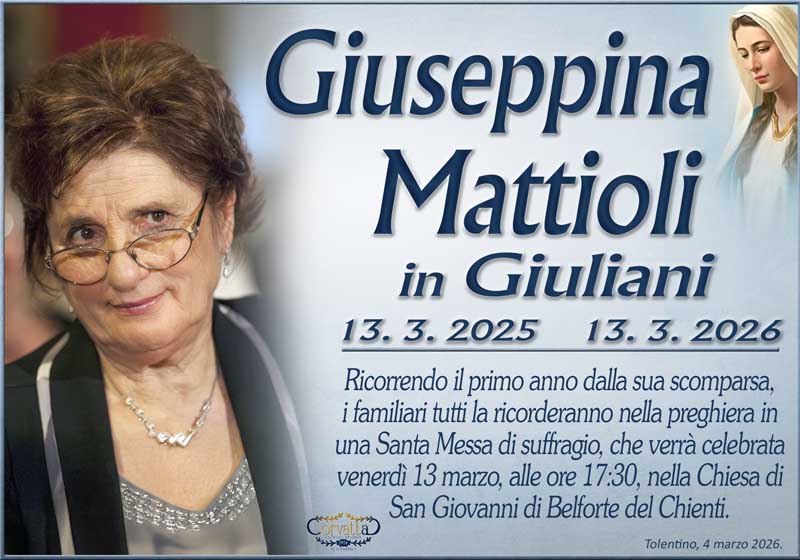 Anniversario: Giuseppina Mattioli Giuliani Anniversario: Giuseppina Mattioli Giuliani 4 Marzo 2026 Gianluca Corvatta Manifesti RecentiAlfei GinaRingraziamento: Maria Grazia Conforti AntoliniAnniversario: Mario CimarelliConforti Maria Grazia AntoliniBrunori GiorgioRingraziamento: Nicoletta Giuliani Gianluca Corvatta 4 Marzo 2026 Categories:Bacheca Manifesti 0 Commenti 0 Likes