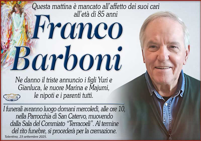 Barboni Franco Barboni Franco 23 Settembre 2025 Gianluca Corvatta Manifesti RecentiRingraziamento: Giorgio BrunoriAlfei GinaAnniversario: Giuseppina Mattioli GiulianiRingraziamento: Maria Grazia Conforti AntoliniAnniversario: Mario CimarelliConforti Maria Grazia Antolini Gianluca Corvatta 23 Settembre 2025 Categories:Bacheca Manifesti 0 Likes