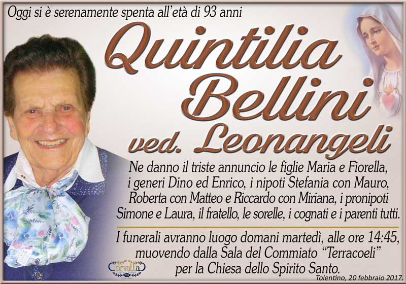 Bellini Quintilia Leonangeli Bellini Quintilia Leonangeli 20 Febbraio 2017 Gianluca Corvatta Manifesti RecentiFrapiselli Agnese โFiorinaโ MattioliRingraziamento: Giorgio BrunoriAlfei GinaAnniversario: Giuseppina Mattioli GiulianiRingraziamento: Maria Grazia Conforti AntoliniAnniversario: Mario Cimarelli Gianluca Corvatta 20 Febbraio 2017 Categories:Bacheca Manifesti 0 Likes