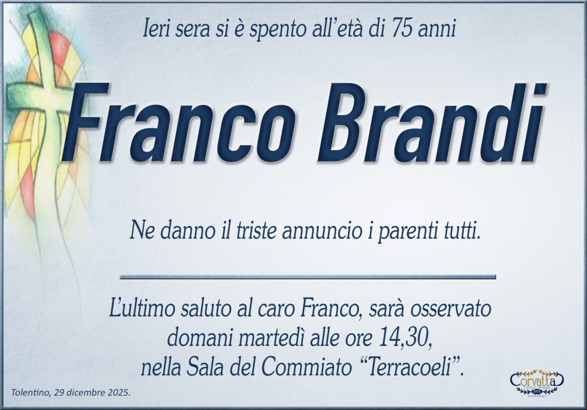 Brandi Franco Brandi Franco 29 Dicembre 2025 Gianluca Corvatta Manifesti RecentiRingraziamento: Giorgio BrunoriAlfei GinaAnniversario: Giuseppina Mattioli GiulianiRingraziamento: Maria Grazia Conforti AntoliniAnniversario: Mario CimarelliConforti Maria Grazia Antolini Gianluca Corvatta 29 Dicembre 2025 Categories:Bacheca Manifesti 0 Likes