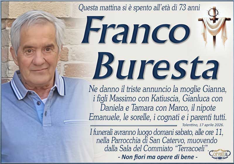 Buresta Franco Buresta Franco 17 Aprile 2026 Gianluca Corvatta Manifesti RecentiAlbucci GiuseppeFerrucci BrunaRingraziamento: Franco Buresta2° Anniversario: Maurizio QuacquariniMari Liuti Giuliana VannicolaRingraziamento: Liborio Boccanera Gianluca Corvatta 17 Aprile 2026 Categories:Bacheca Manifesti 0 Commenti 0 Likes