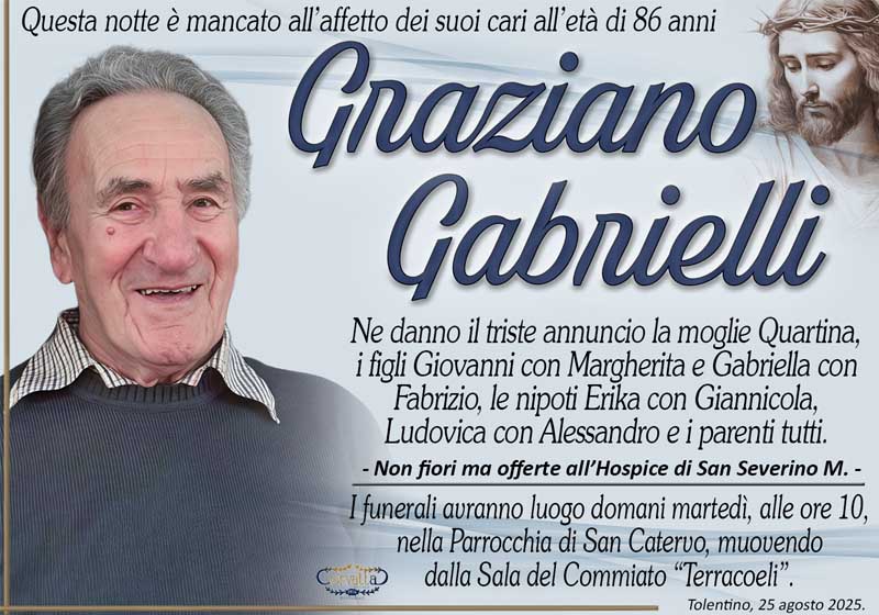 Gabrielli Graziano Gabrielli Graziano 25 Agosto 2025 Gianluca Corvatta Manifesti RecentiRingraziamento: Giorgio BrunoriAlfei GinaAnniversario: Giuseppina Mattioli GiulianiRingraziamento: Maria Grazia Conforti AntoliniAnniversario: Mario CimarelliConforti Maria Grazia Antolini Gianluca Corvatta 25 Agosto 2025 Categories:Bacheca Manifesti 0 Likes