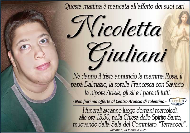 Giuliani Nicoletta Giuliani Nicoletta 24 Febbraio 2026 Gianluca Corvatta Manifesti RecentiAlfei GinaAnniversario: Giuseppina Mattioli GiulianiRingraziamento: Maria Grazia Conforti AntoliniAnniversario: Mario CimarelliConforti Maria Grazia AntoliniBrunori Giorgio Gianluca Corvatta 24 Febbraio 2026 Categories:Bacheca Manifesti 0 Commenti 0 Likes