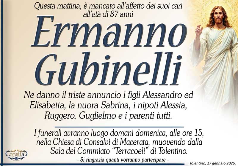 Gubinelli Ermanno Gubinelli Ermanno 17 Gennaio 2026 Gianluca Corvatta Manifesti RecentiAlfei GinaAnniversario: Giuseppina Mattioli GiulianiRingraziamento: Maria Grazia Conforti AntoliniAnniversario: Mario CimarelliConforti Maria Grazia AntoliniBrunori Giorgio Gianluca Corvatta 17 Gennaio 2026 Categories:Bacheca Manifesti 0 Likes