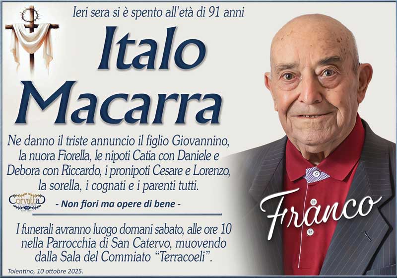 Macarra “Franco” Italo Macarra “Franco” Italo 10 Ottobre 2025 Gianluca Corvatta Manifesti RecentiRingraziamento: Giorgio BrunoriAlfei GinaAnniversario: Giuseppina Mattioli GiulianiRingraziamento: Maria Grazia Conforti AntoliniAnniversario: Mario CimarelliConforti Maria Grazia Antolini Gianluca Corvatta 10 Ottobre 2025 Categories:Bacheca Manifesti 0 Likes