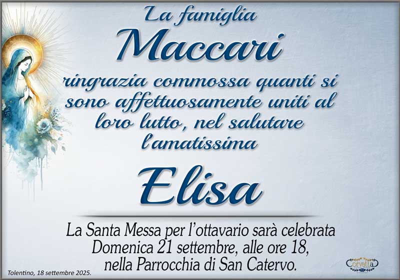 Ringraziamento: Elisa Dignani Maccari Ringraziamento: Elisa Dignani Maccari 19 Settembre 2025 Gianluca Corvatta Manifesti RecentiRingraziamento: Giorgio BrunoriAlfei GinaAnniversario: Giuseppina Mattioli GiulianiRingraziamento: Maria Grazia Conforti AntoliniAnniversario: Mario CimarelliConforti Maria Grazia Antolini Gianluca Corvatta 19 Settembre 2025 Categories:Bacheca Manifesti 0 Likes