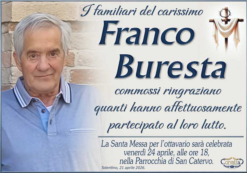 Ringraziamento: Franco Buresta Ringraziamento: Franco Buresta 21 Aprile 2026 Gianluca Corvatta Manifesti RecentiAlbucci GiuseppeFerrucci Bruna2° Anniversario: Maurizio QuacquariniMari Liuti Giuliana VannicolaBuresta FrancoRingraziamento: Liborio Boccanera Gianluca Corvatta 21 Aprile 2026 Categories:Bacheca Manifesti 0 Commenti 0 Likes