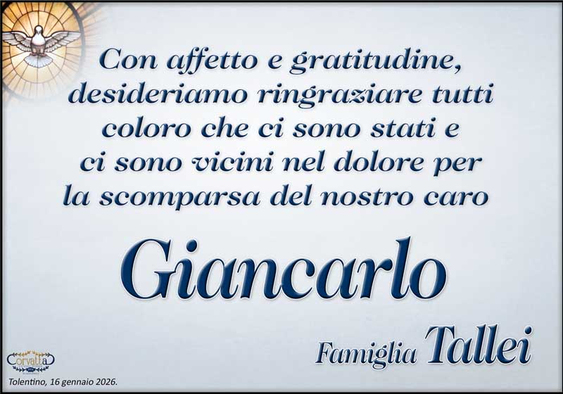 Ringraziamento: Giancarlo Tallei Ringraziamento: Giancarlo Tallei 16 Gennaio 2026 Gianluca Corvatta Manifesti RecentiAlfei GinaAnniversario: Giuseppina Mattioli GiulianiRingraziamento: Maria Grazia Conforti AntoliniAnniversario: Mario CimarelliConforti Maria Grazia AntoliniBrunori Giorgio Gianluca Corvatta 16 Gennaio 2026 Categories:Bacheca Manifesti 0 Likes