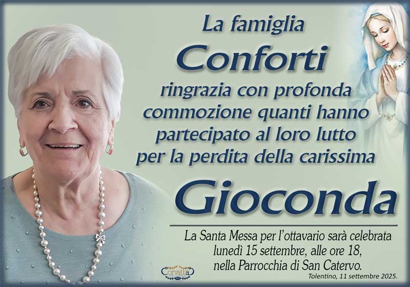 Ringraziamento: Gioconda Bertoni Conforti Ringraziamento: Gioconda Bertoni Conforti 11 Settembre 2025 Gianluca Corvatta Manifesti RecentiRingraziamento: Giorgio BrunoriAlfei GinaAnniversario: Giuseppina Mattioli GiulianiRingraziamento: Maria Grazia Conforti AntoliniAnniversario: Mario CimarelliConforti Maria Grazia Antolini Gianluca Corvatta 11 Settembre 2025 Categories:Bacheca Manifesti 0 Likes
