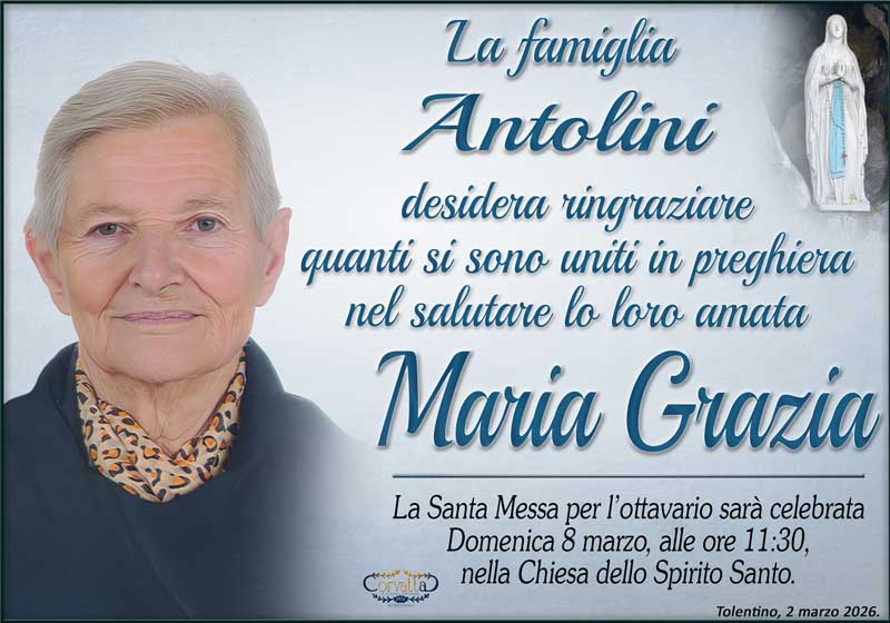 Ringraziamento: Maria Grazia Conforti Antolini Ringraziamento: Maria Grazia Conforti Antolini 2 Marzo 2026 Gianluca Corvatta Manifesti RecentiAlfei GinaAnniversario: Giuseppina Mattioli GiulianiAnniversario: Mario CimarelliConforti Maria Grazia AntoliniBrunori GiorgioRingraziamento: Nicoletta Giuliani Gianluca Corvatta 2 Marzo 2026 Categories:Bacheca Manifesti 0 Commenti 0 Likes