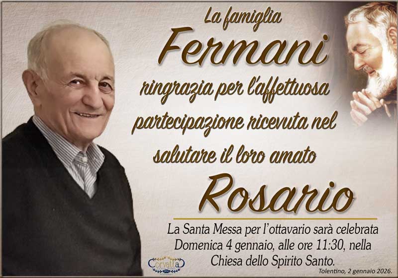 Ringraziamento: Rosario Fermani Ringraziamento: Rosario Fermani 3 Gennaio 2026 Gianluca Corvatta Manifesti RecentiRingraziamento: Giorgio BrunoriAlfei GinaAnniversario: Giuseppina Mattioli GiulianiRingraziamento: Maria Grazia Conforti AntoliniAnniversario: Mario CimarelliConforti Maria Grazia Antolini Gianluca Corvatta 3 Gennaio 2026 Categories:Bacheca Manifesti 0 Likes