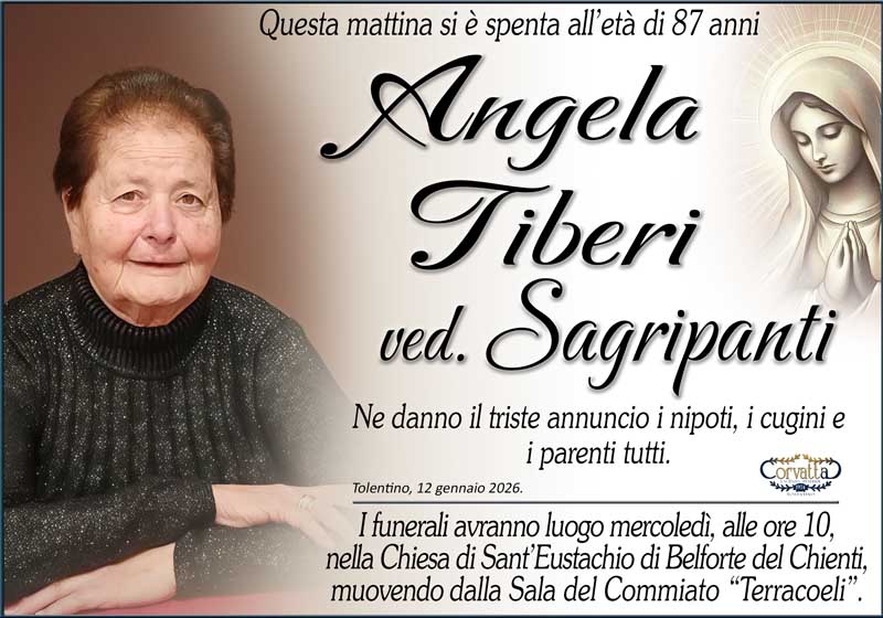 Tiberi Angela Sagripanti Tiberi Angela Sagripanti 12 Gennaio 2026 Gianluca Corvatta Manifesti RecentiRingraziamento: Giorgio BrunoriAlfei GinaAnniversario: Giuseppina Mattioli GiulianiRingraziamento: Maria Grazia Conforti AntoliniAnniversario: Mario CimarelliConforti Maria Grazia Antolini Gianluca Corvatta 12 Gennaio 2026 Categories:Bacheca Manifesti 7 Likes