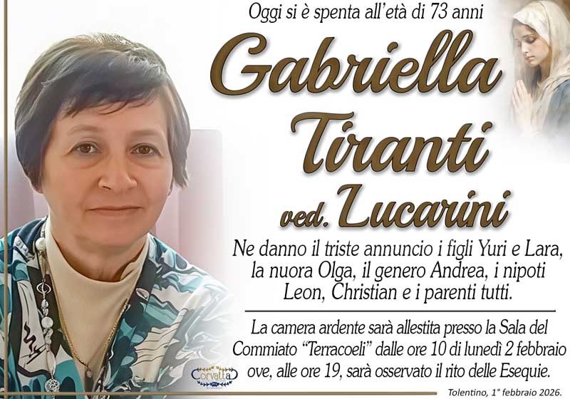 Tiranti Gabriella Lucarini Tiranti Gabriella Lucarini 1 Febbraio 2026 Gianluca Corvatta Manifesti RecentiAlfei GinaAnniversario: Giuseppina Mattioli GiulianiRingraziamento: Maria Grazia Conforti AntoliniAnniversario: Mario CimarelliConforti Maria Grazia AntoliniBrunori Giorgio Gianluca Corvatta 1 Febbraio 2026 Categories:Bacheca Manifesti 0 Likes