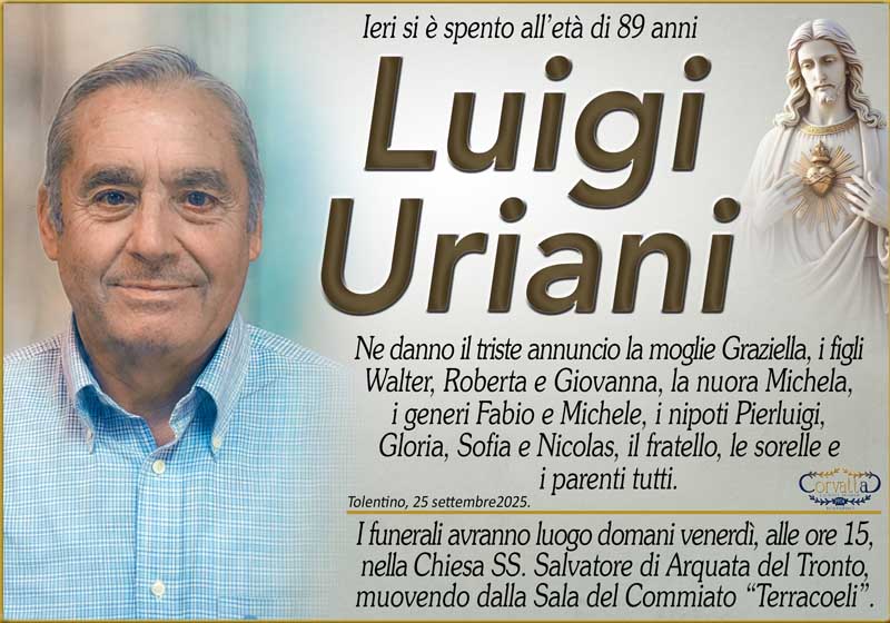 Uriani Luigi Uriani Luigi 25 Settembre 2025 Gianluca Corvatta Manifesti RecentiRingraziamento: Giorgio BrunoriAlfei GinaAnniversario: Giuseppina Mattioli GiulianiRingraziamento: Maria Grazia Conforti AntoliniAnniversario: Mario CimarelliConforti Maria Grazia Antolini Gianluca Corvatta 25 Settembre 2025 Categories:Bacheca Manifesti 0 Likes